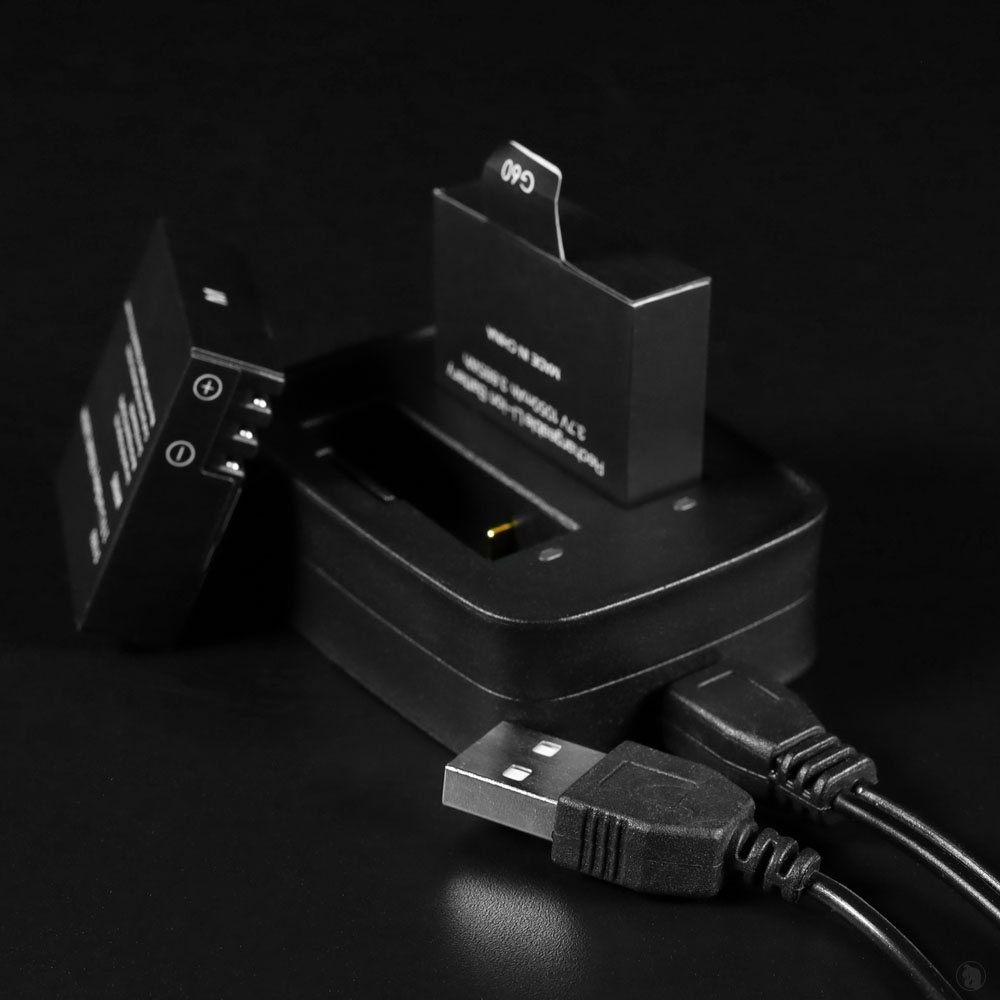 This charging base allows you to charge 2 Phasm Cam batteries at one time. This way, you can be using one while the second is charging. The base comes with a USB charging cable.