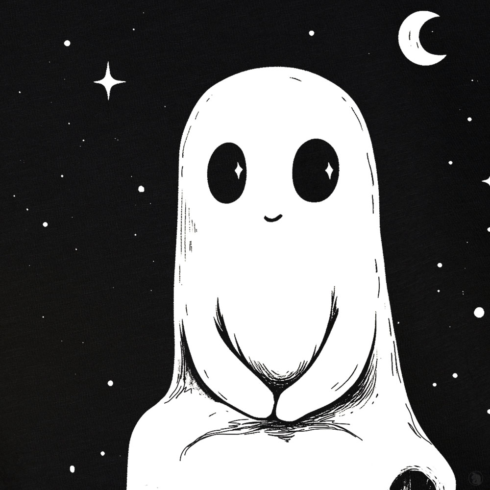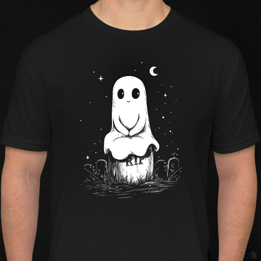 This little spirit is just waiting for your next ghost hunt. This design t-shirt art features a serene ghost perched upon a tomestone, its adoring eyes just yearning for the next hunt. This shirt captures the allure of the supernatural intertwined with the beauty of nature's embrace. Perfect for those who appreciate the magic of the paranormal in nature - especially at night.