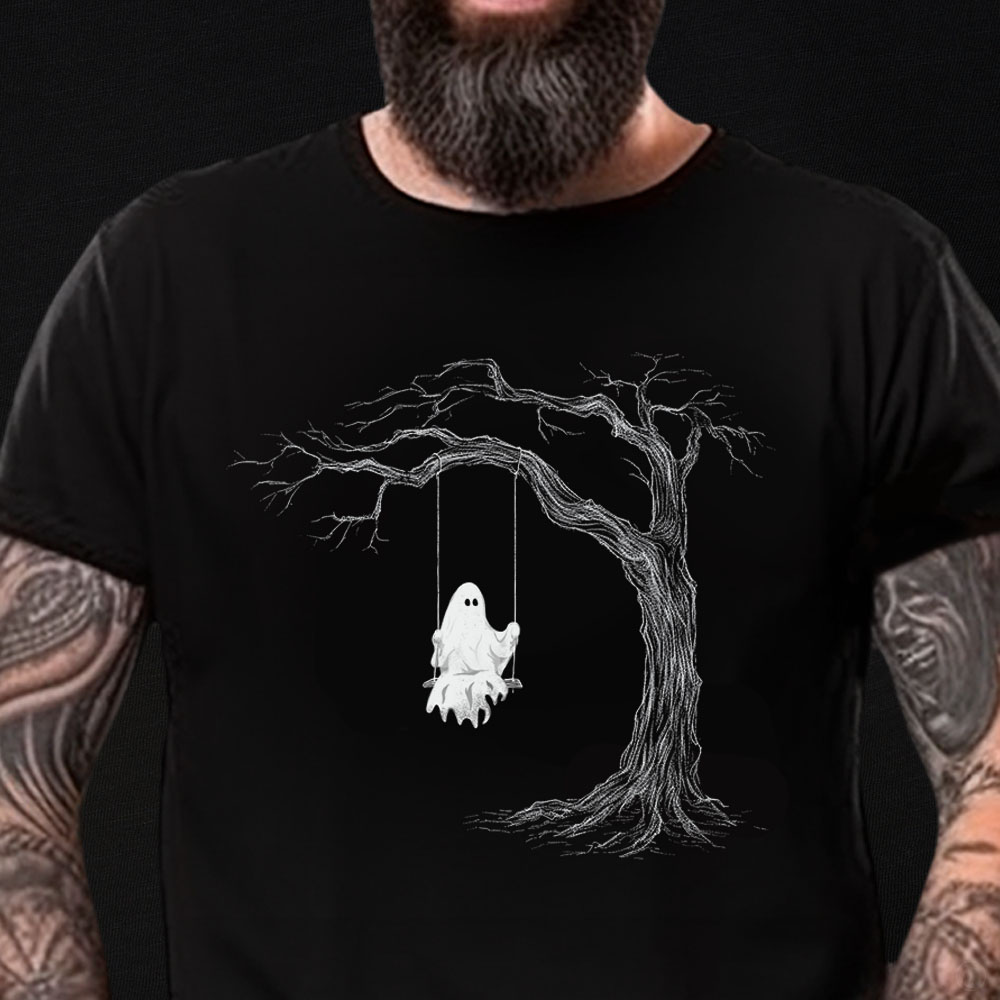 This enchanting t-shirt art features a serene ghost perched upon a gnarled tree swing, its spectral form blending seamlessly with the swaying in the night. The ghostly figure emanates a sense of mystery and wonder as it serenades the night with its haunting song. This shirt captures the allure of the supernatural intertwined with the beauty of nature's embrace. Perfect for those who appreciate the magic of the paranormal in nature - especially at night.